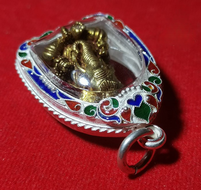 婆罗门教象神是重要的创世几大主神之一,掌握世间财富之神,也是智慧之神,提升佩戴者权势及地位威望,开启智慧,助学业,生意兴隆,事业稳步前进。 这期龙婆本象神,是师父最漂亮一期,传统象神法相,材质使用僧人化缘的钵融合纯金制作法相,2535年象神制作数量不多,市场上更是难寻。这一期是与龙婆本专业收藏家,聊了半年时间,泰国藏家才肯放手,虽然不算最顶级的象神,这毕竟是龙婆本象神里,佛牌界公认流行的之一。龙婆本是近代阿罗汉果位高僧,师父的老虎佛牌,自身、鲁士、象神都是炙手可热的圣物,龙婆本法力刺符更是泰国的权威。